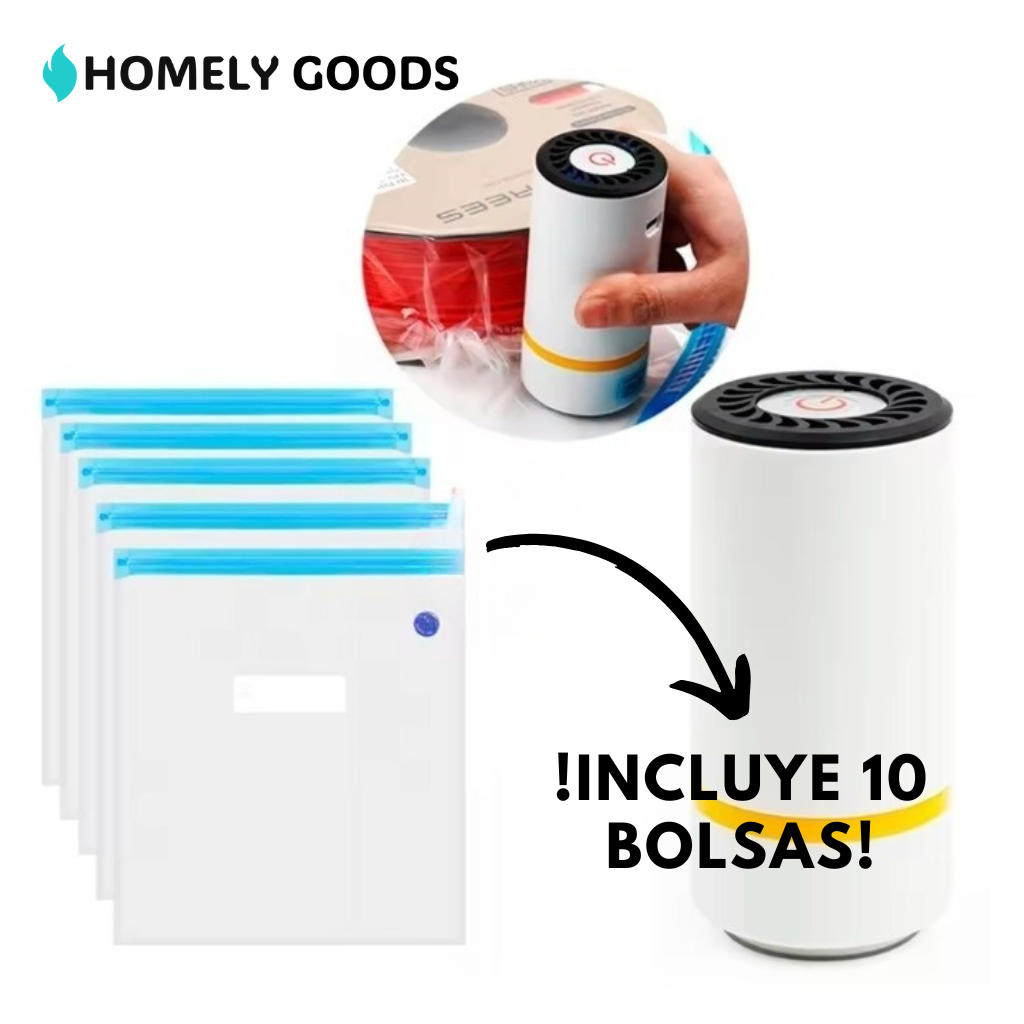 Incluye 1 sellador portátil SealMate™, 10 bolsas reutilizables con clip de sellado, y 1 cable USB para recargar. ¡Todo lo que necesitas para empezar!